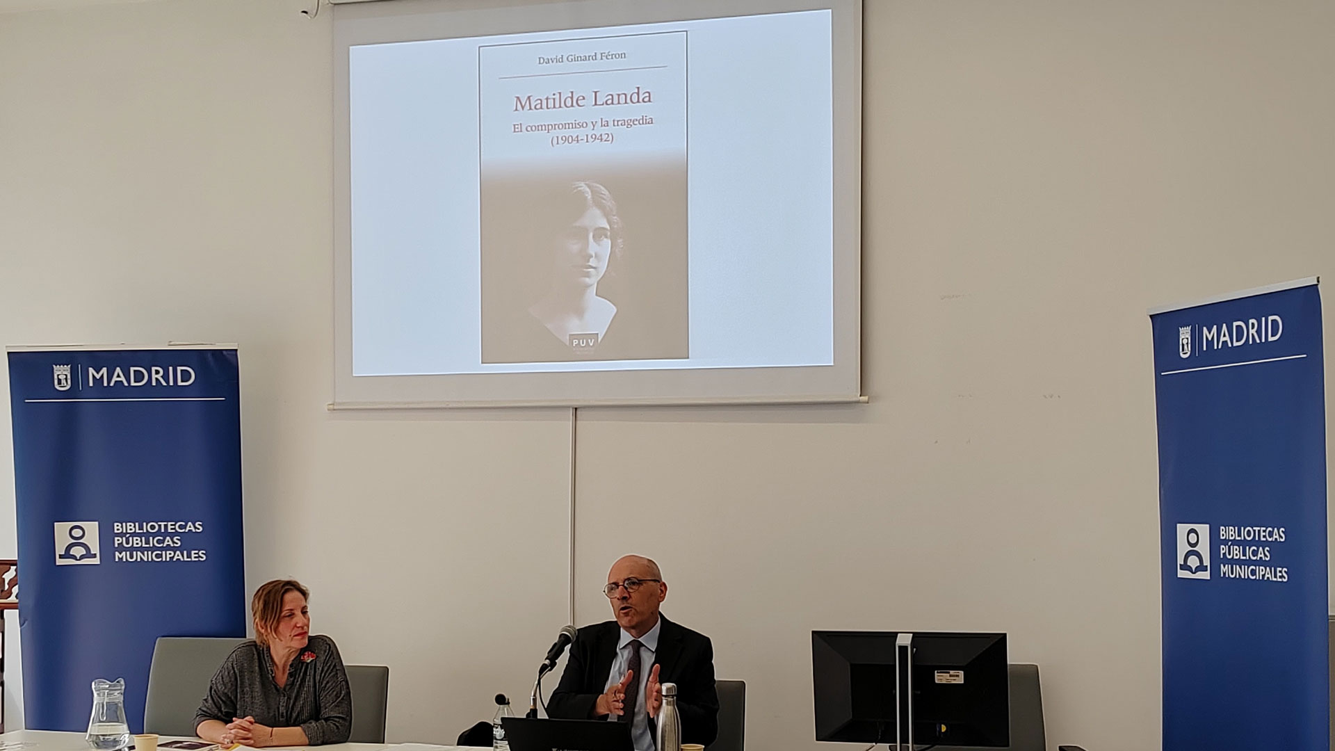El pasado miércoles 7 de mayo de 2025 a las 19 horas David Ginard Féron presentó en la Biblioteca Pública Municipal Ángel González de Madrid su libro “Matilde Landa, El compromiso y la tragedia (1904 – 1942)” de la Editorial “Publicacions de la Universitat de València”.